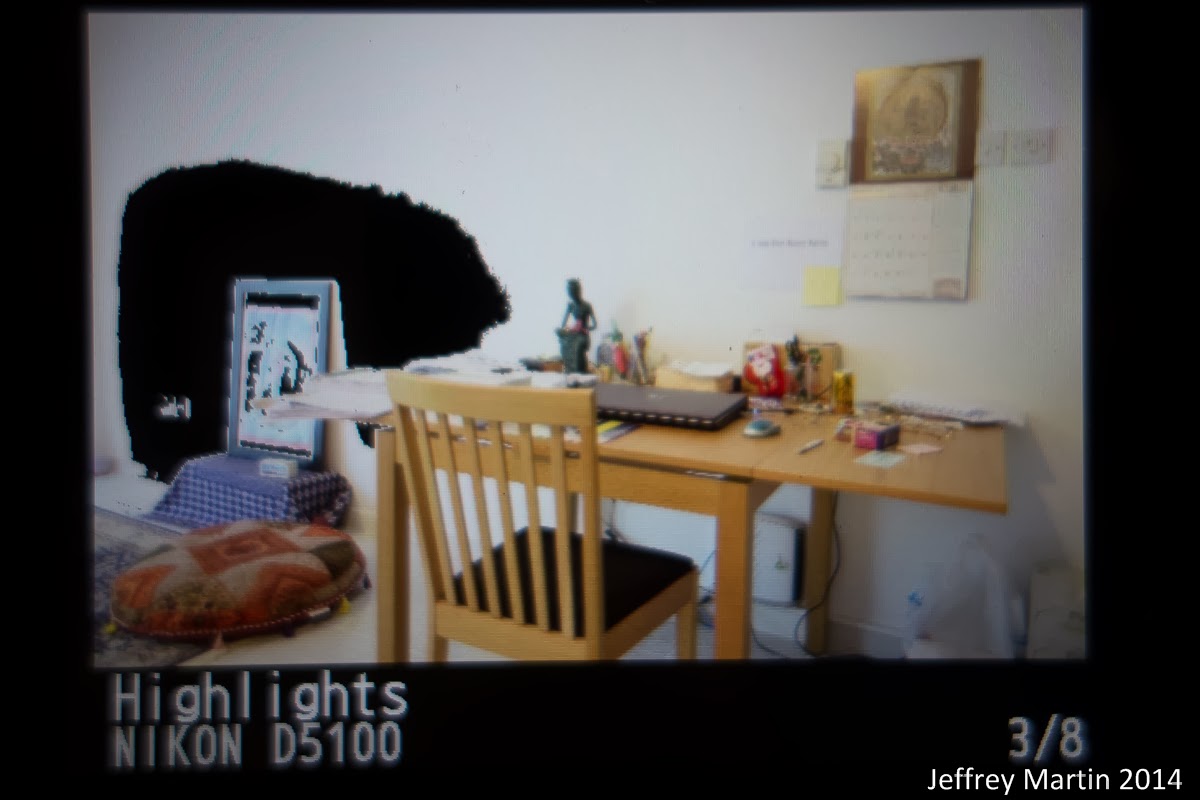 This is a rather poor capture from my iPad, but it serves the purpose as it shows the camera reading a large area of highlight clipping on the left near a window. This flashes black in camera. Note that the histograms show minimal clipping in blue. Also note that this is not a live view available while shooting, but viewable only after capture.